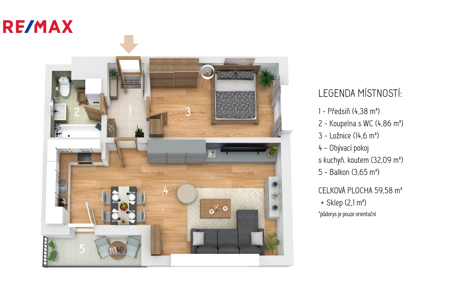Z předsíně můžete vstoupit do ložnice, koupelny s WC ale hlavně do hlavního obytného prostoru s moderním a vybaveným kuchyňským koutem. Obývací pokoj nabízí dostatek místa pro pohodlné denní fungování a výstup na příjemně velký balkon, kde se dá v klidu posedět. Ložnice poskytuje klidné a útulné útočiště pro zasloužený odpočinek.