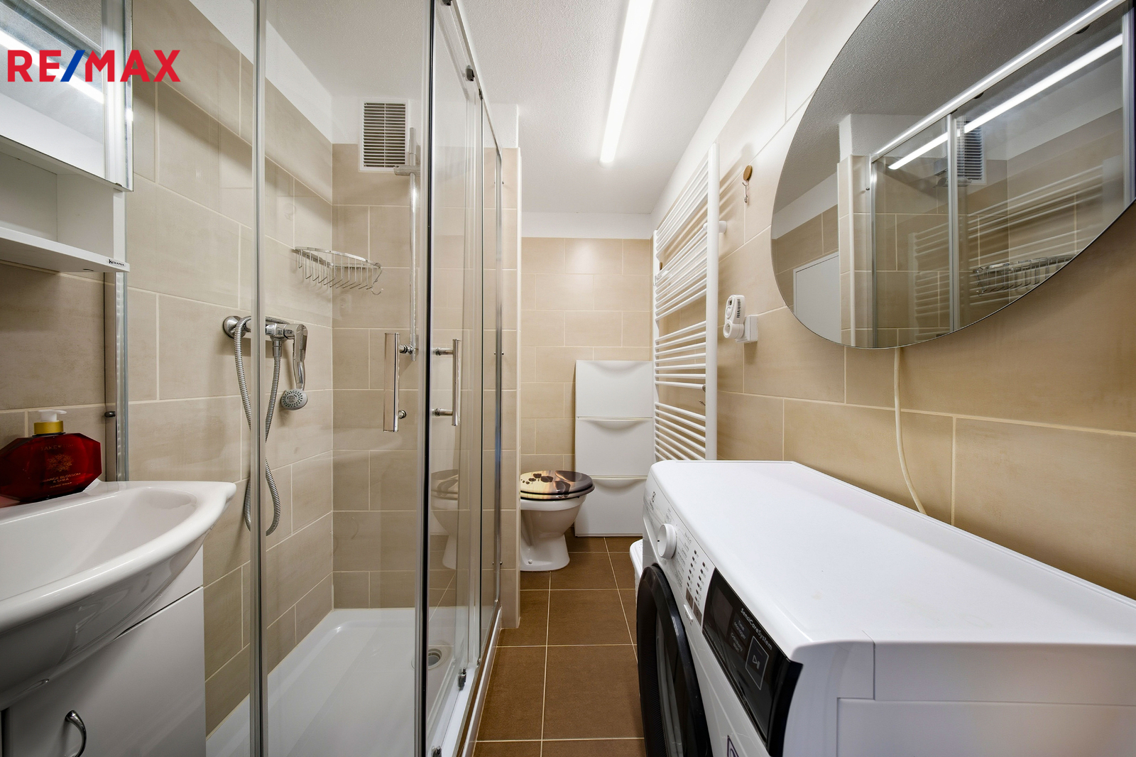 koupelna po rekonstrukci (sprchový kout, umyvadlo, toaleta)
